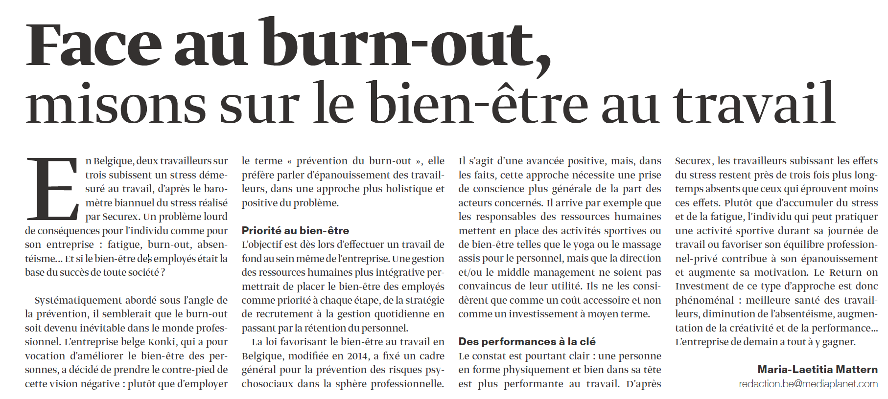 Konki dans le supplément "Bien-être au travail" du Trends Tendances de cette semaine dans un article de Maria-Laetitia Mattern En Belgique, deux travailleurs sur trois subissent un stress démesuré au travail, d’après le baromètre biannuel du stress réalisé par Securex. Un problème lourd de conséquences pour l’individu comme pour son entreprise : fatigue, burn-out, absentéisme... Et si le bien-être des employés était la base du succès de toute société? Lire la suite