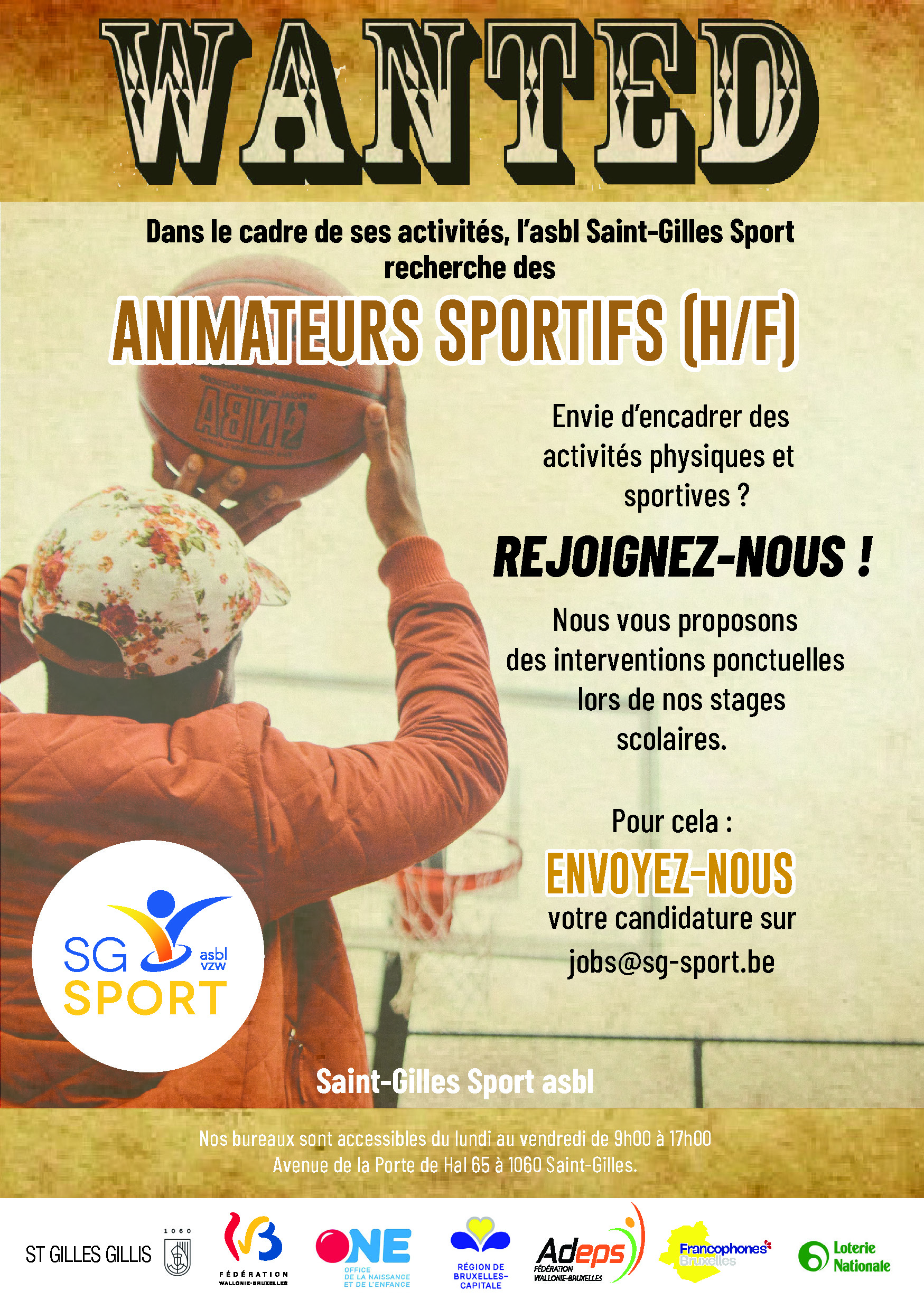 Envie de rejoindre une équipe de sportifs(ves) motivé(es) et d'évoluer dans une ambiance agréable et dynamique ? Nous recherchons : des professeurs d'éducation physique ,des bénévoles pour notre école de devoirs , des animateurs(rices) breveté(es), des sportifs(ves) passionné(es), des maitres-nageurs(euses) breveté(es) BSSA. Envoyez-nous votre CV à jobs@sg-sport.be